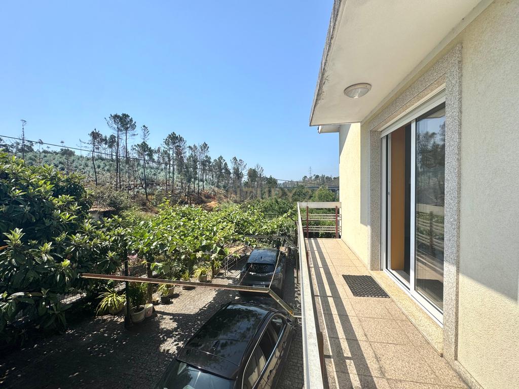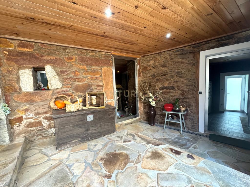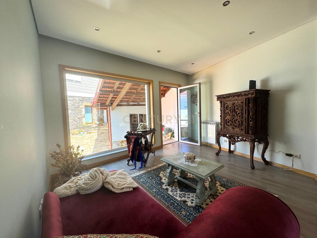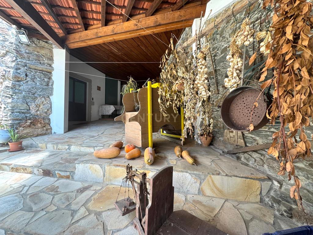 A habitação de grande horizontalidade tem uma fachada em capoto e no interior um belo e amplo alpendre de onde se ouvem os vários chilreares de pássaros e o cantar da água do ribeiro, também pertencente à propriedade para passar ótimos momentos de convívio.