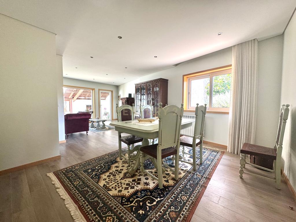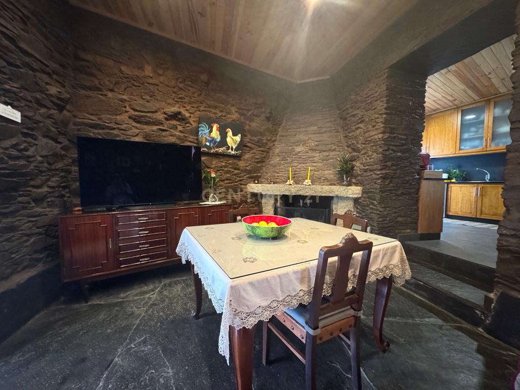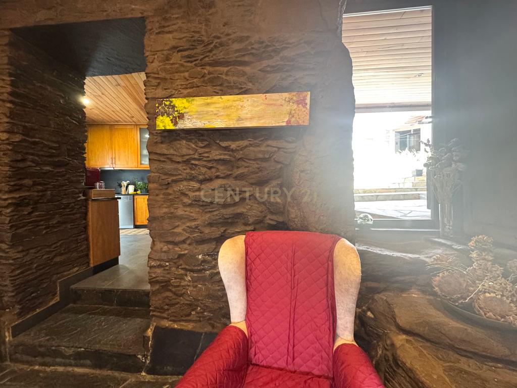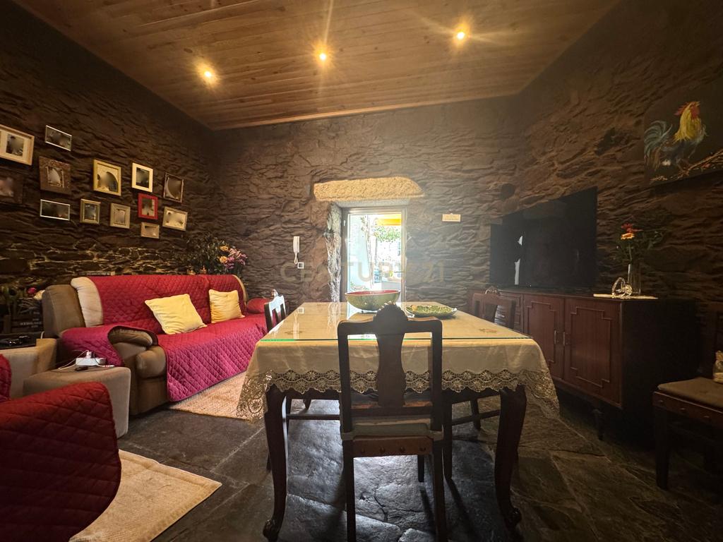 A habitação de grande horizontalidade tem uma fachada em capoto e no interior um belo e amplo alpendre de onde se ouvem os vários chilreares de pássaros e o cantar da água do ribeiro, também pertencente à propriedade para passar ótimos momentos de convívio.