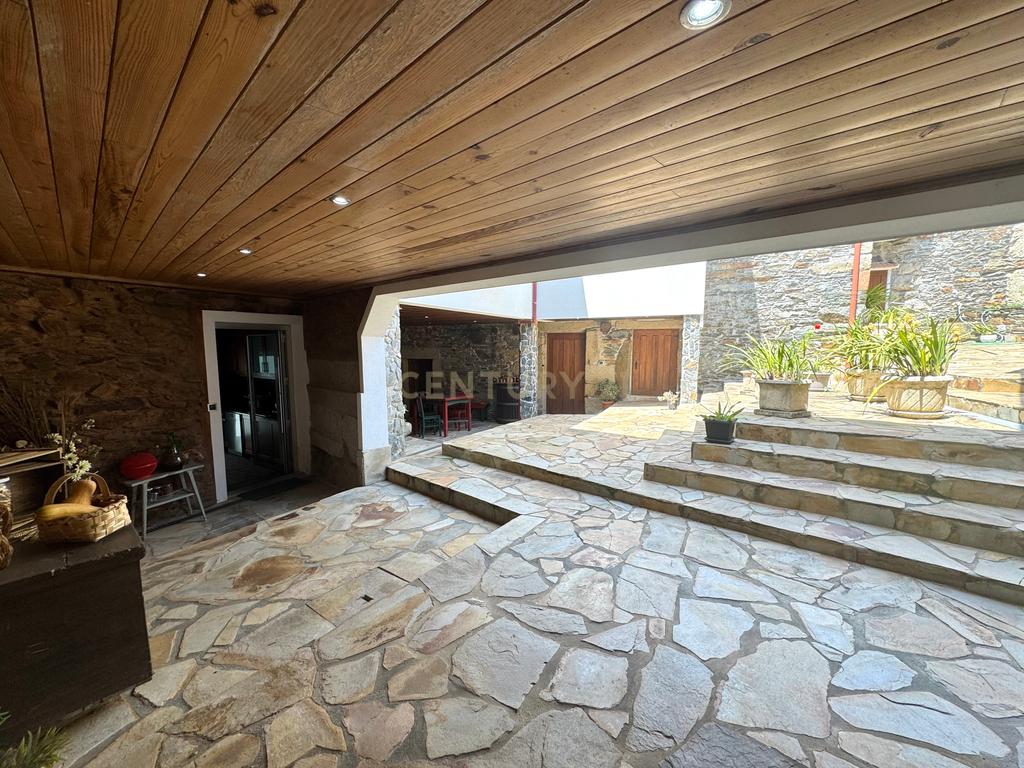 Num pátio no interior e ao ar livre existem uns alpendres com área exterior utilizado para festas e convívios onde ressaltam os tetos revestidos de grossas e lindas traves. Este espaço também dá acesso a uma entrada secundária de mais 3 casas, ao forno, às adegas, espaços de alfaias agrícolas e a outra de 2 garagens.
